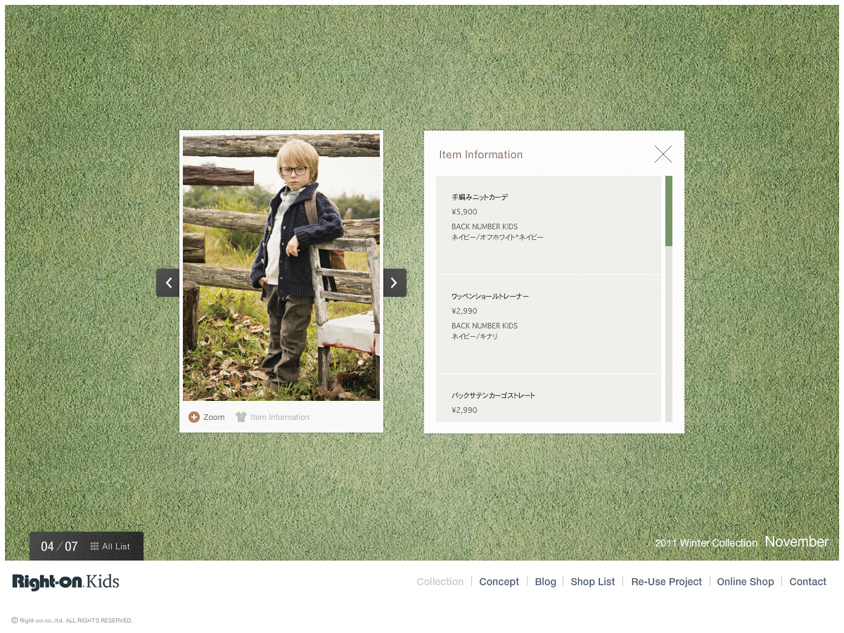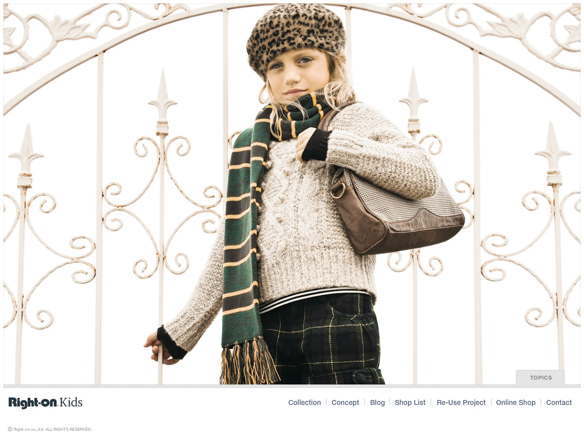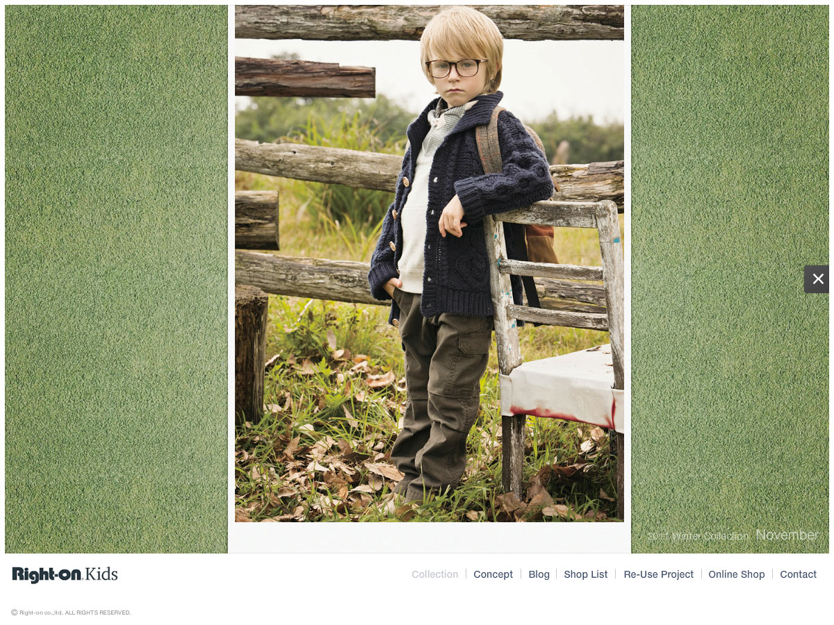 Right-on Kids Posted on 10/14/201110/15/2022 Web Site Client: Right-onYear: 2011Direction: full size imageDesign/Coding: Keigo kurihara (full size image)Site Closed カジュアルウェアを販売するライトオンによる子供向けブランド「ライトオン キッズ」。ブランドイメージである、カジュアルで少し大人びた雰囲気のビジュアルを使いながらも、細かなあしらいや動きによって「かわいらしさ」を忘れない演出となっている。(公開終了)